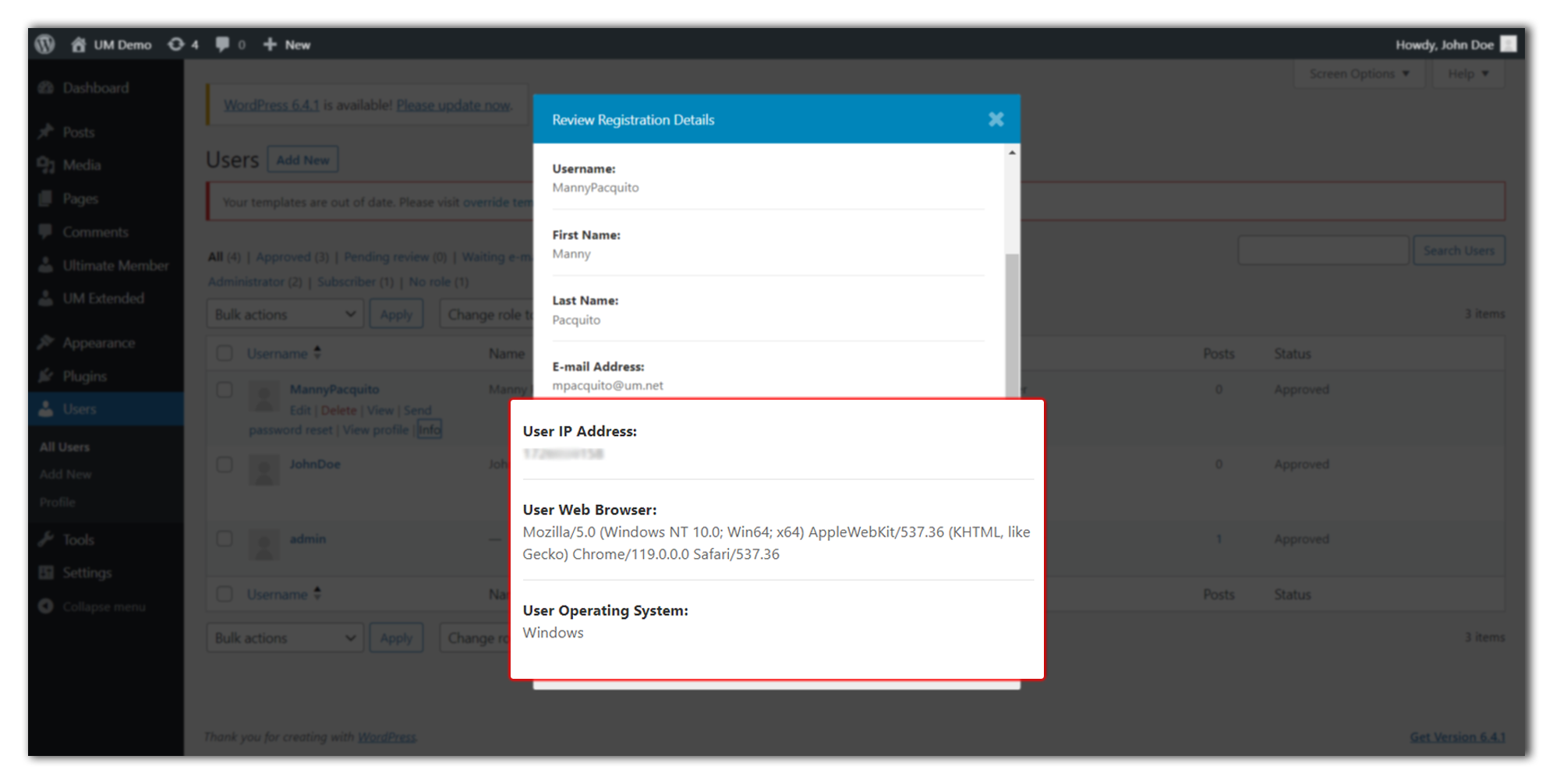 Upon accessing the "Review Registration Details" window, you'll have visibility into crucial user information. Here, you can seamlessly observe and analyze the user's IP Address, Operating System, and Web Browser, providing you with a comprehensive overview of their registration details. This added layer of information enhances your understanding of user interactions on your site.