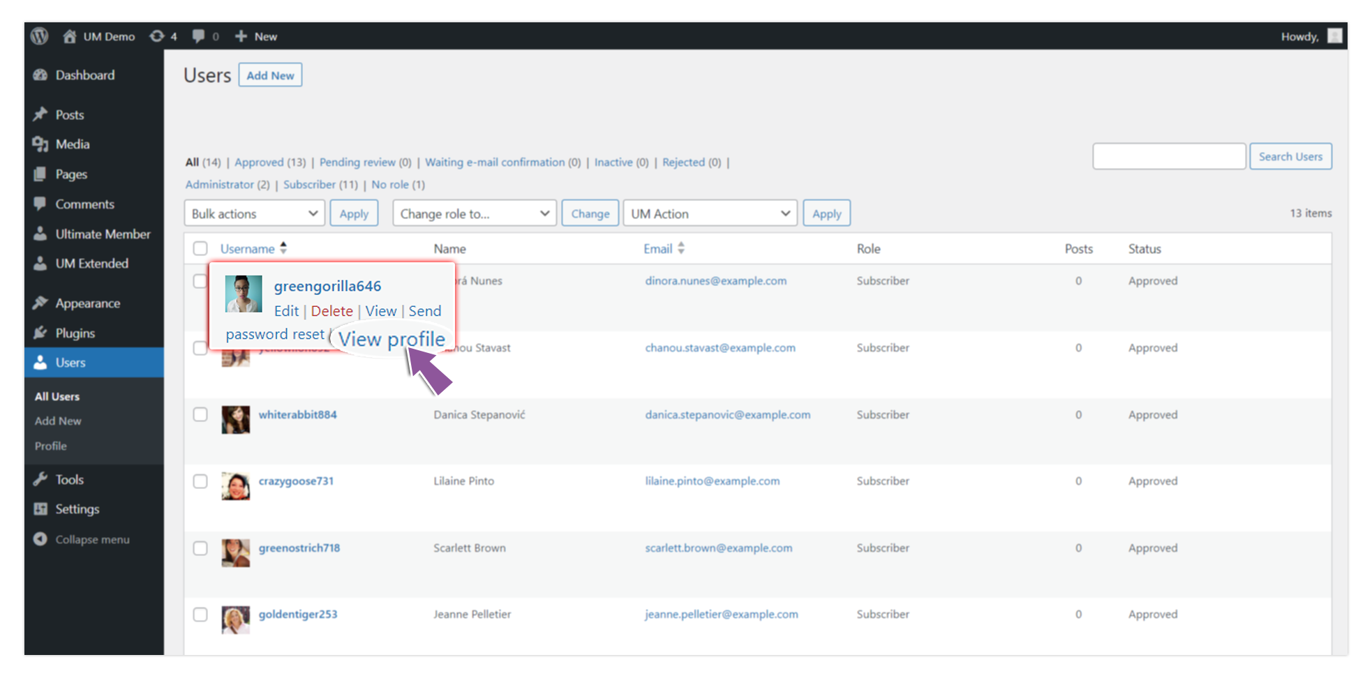 Check the generated dummies in wp-admin > Users. Hover over a dummy user and click "View Profile" to see the dummy account's profile.